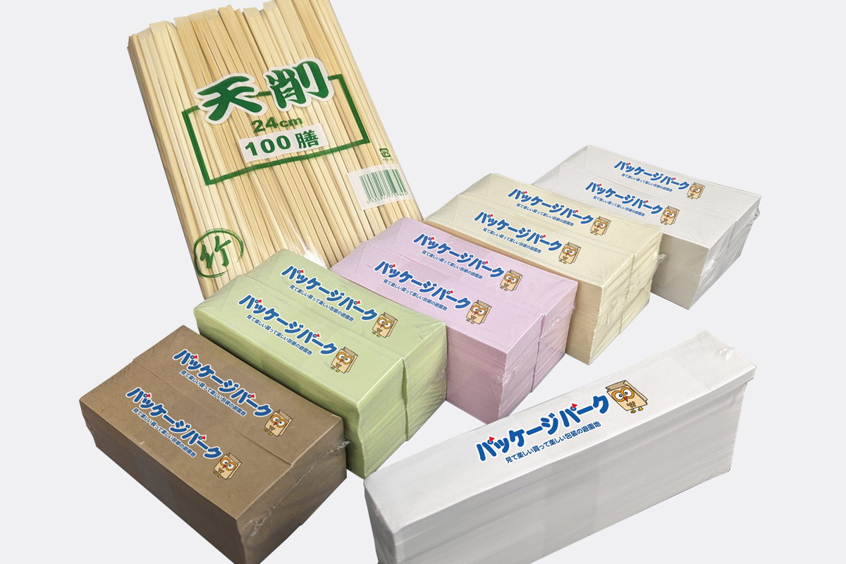 包装資材・ラッピング資材・食品容器・日用雑貨・厨房機器・衛生商品・のぼりのれんとなんでもお任せあれ。